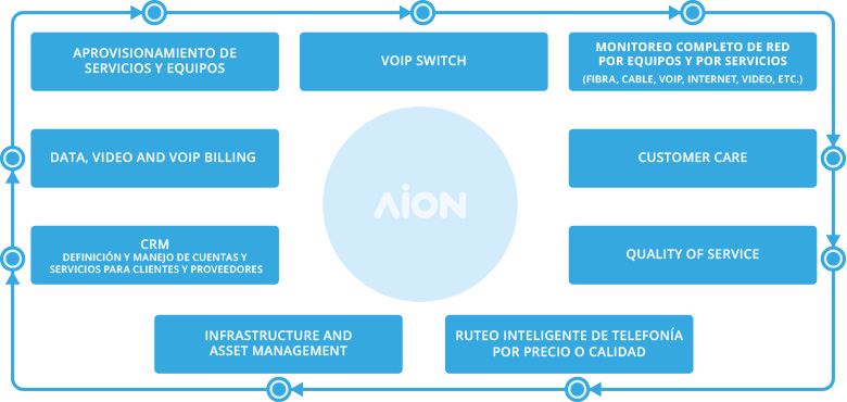 AION permite al Proveedor de Servicios gestionar de manera eficiente los servicios de Voz, Datos y Vídeo a sus Clientes en sus Redes de Nueva Generación, tanto FTTH, HFC o Par de Cobre con distintos planes de Servicios.